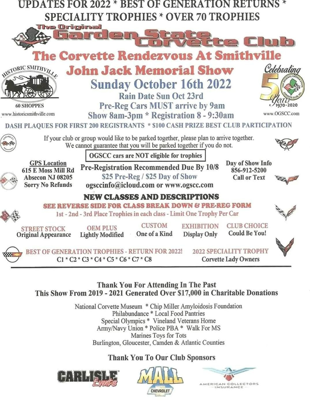 The Corvette Show is sponsored by The Original Garden State Corvette Club who will host 100+ Corvettes throughout the Smithville Village Car Shows and Car Cruises for 2025 Corvette Show: Oct 19th, 2025 (Rain Nov2nd) This show is for Corvettes only and hosted by OGSTCC